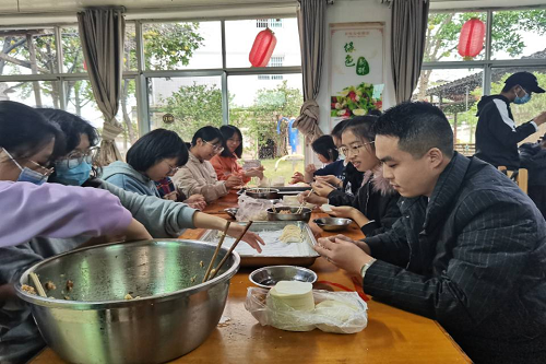当天下午,志愿者们在铜像广场上集合完毕,井然有序地来到了锦德敬老院。志愿者们关心询问了老人们的身体状况并和老人们一起切菜做肉馅。随后,所有成员一起包饺子,大家热情饱满,细心地将饺子皮展平,共同包了1000个饱满可爱的饺子,并将饺子摆成了“百善孝为先”的样式,以表今后将“孝”行志愿活动坚持到底的决心。在此期间,刘韬老师和同学们一起包饺子并和同学们讲述这其中的技巧和内涵,同学们听得十分认真,受益匪浅。最后,志愿者们为老人表演节目,帮助老人打扫卫生,和老人谈心、谈家常。