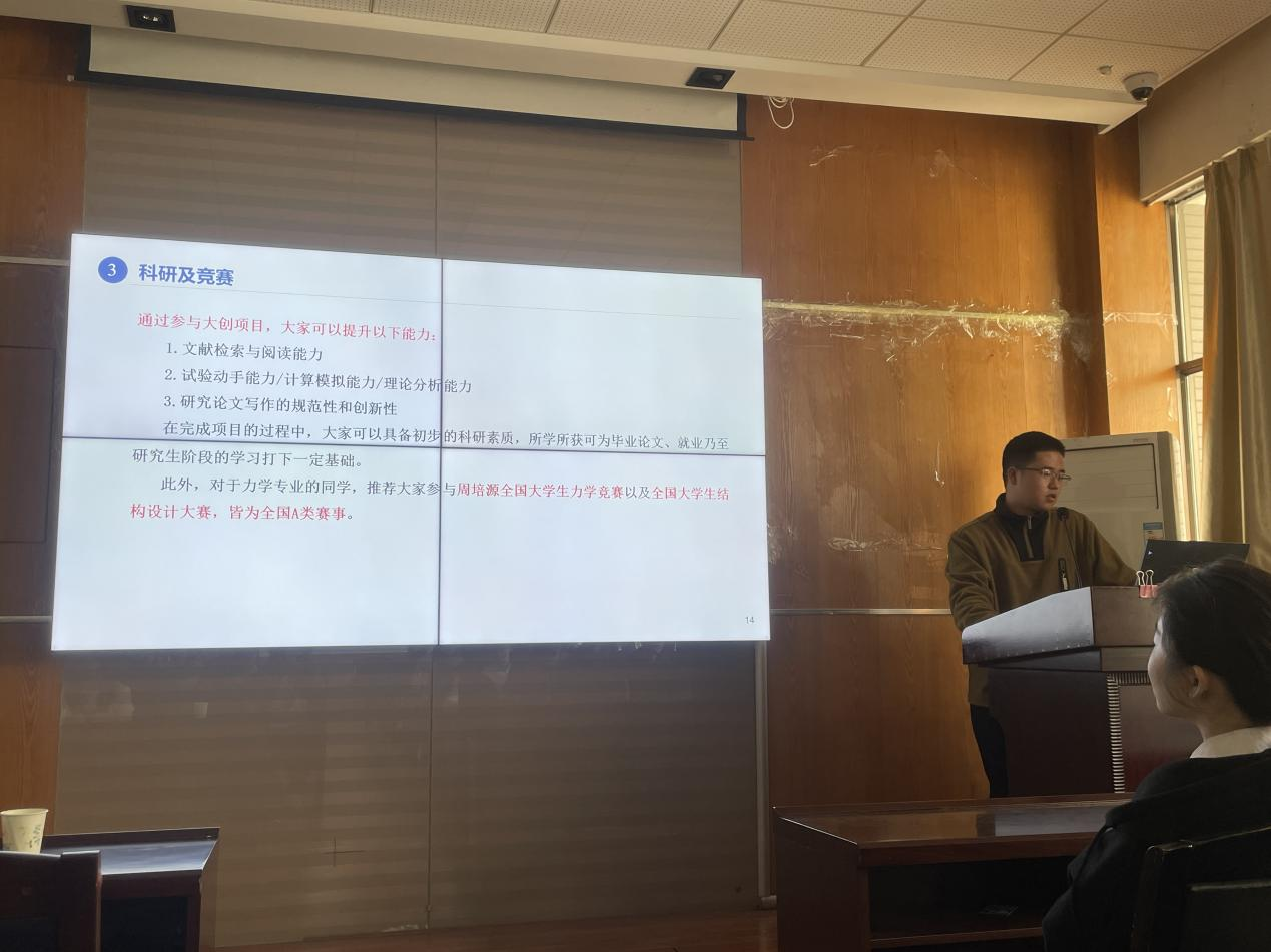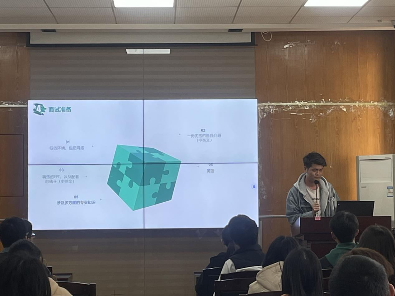 分享会过半,之后是综合测评专业第一、保研至西安交通大学、曾获国家奖学金、国家励志奖学金等的龚庆。他分享道,在平时的学习中可以找到志同道合的好友一起学习,讨论专业知识,有助于提高自己对于专业知识的认知水平。参加竞赛和大创不仅可以提升自己的文字检索与阅读能力,实验动手能力等能力还能增加研究论文的写作规范性和创新性,又从就业方面进行了补充并分析了本专业未来的就业方向。
