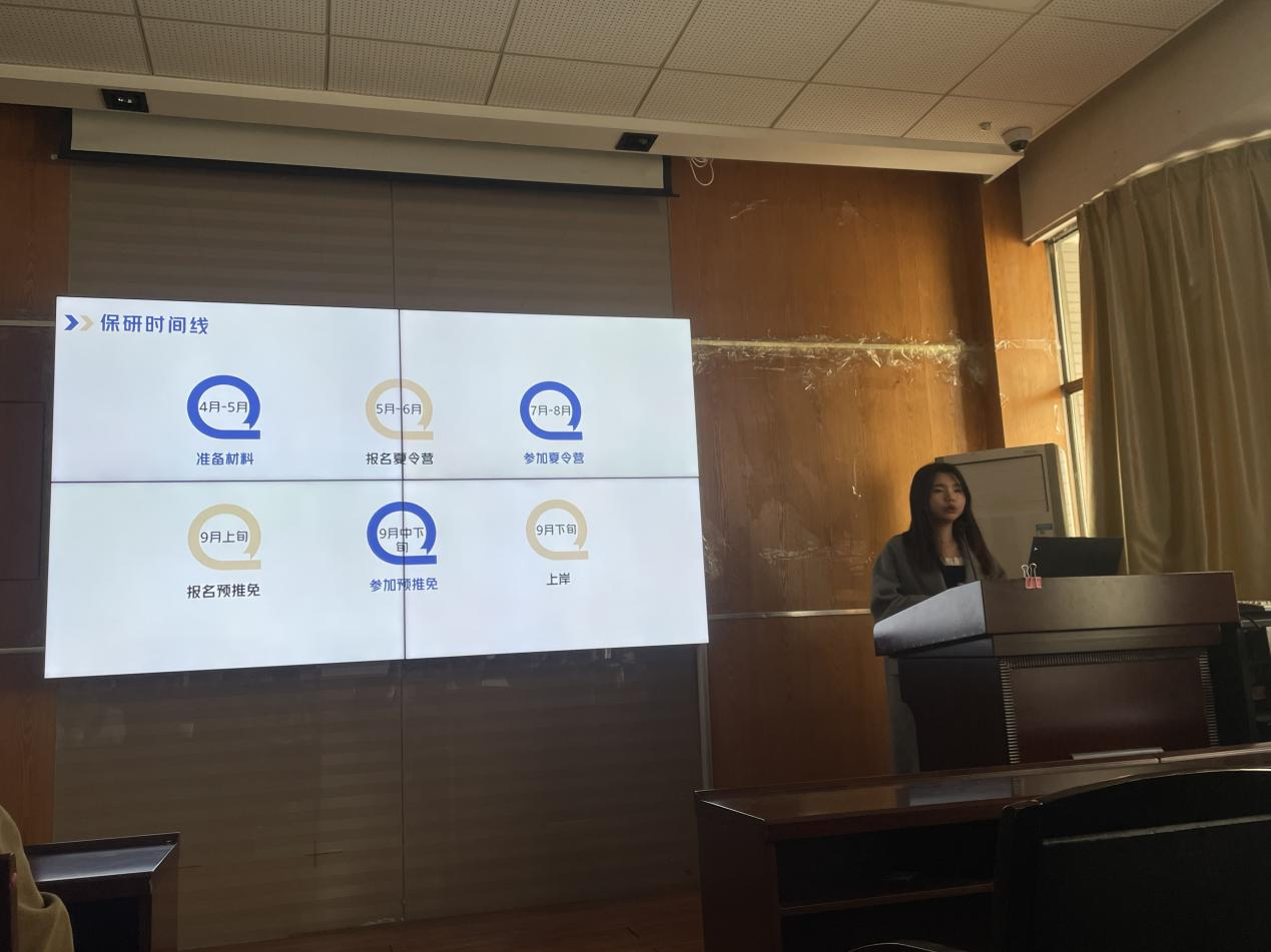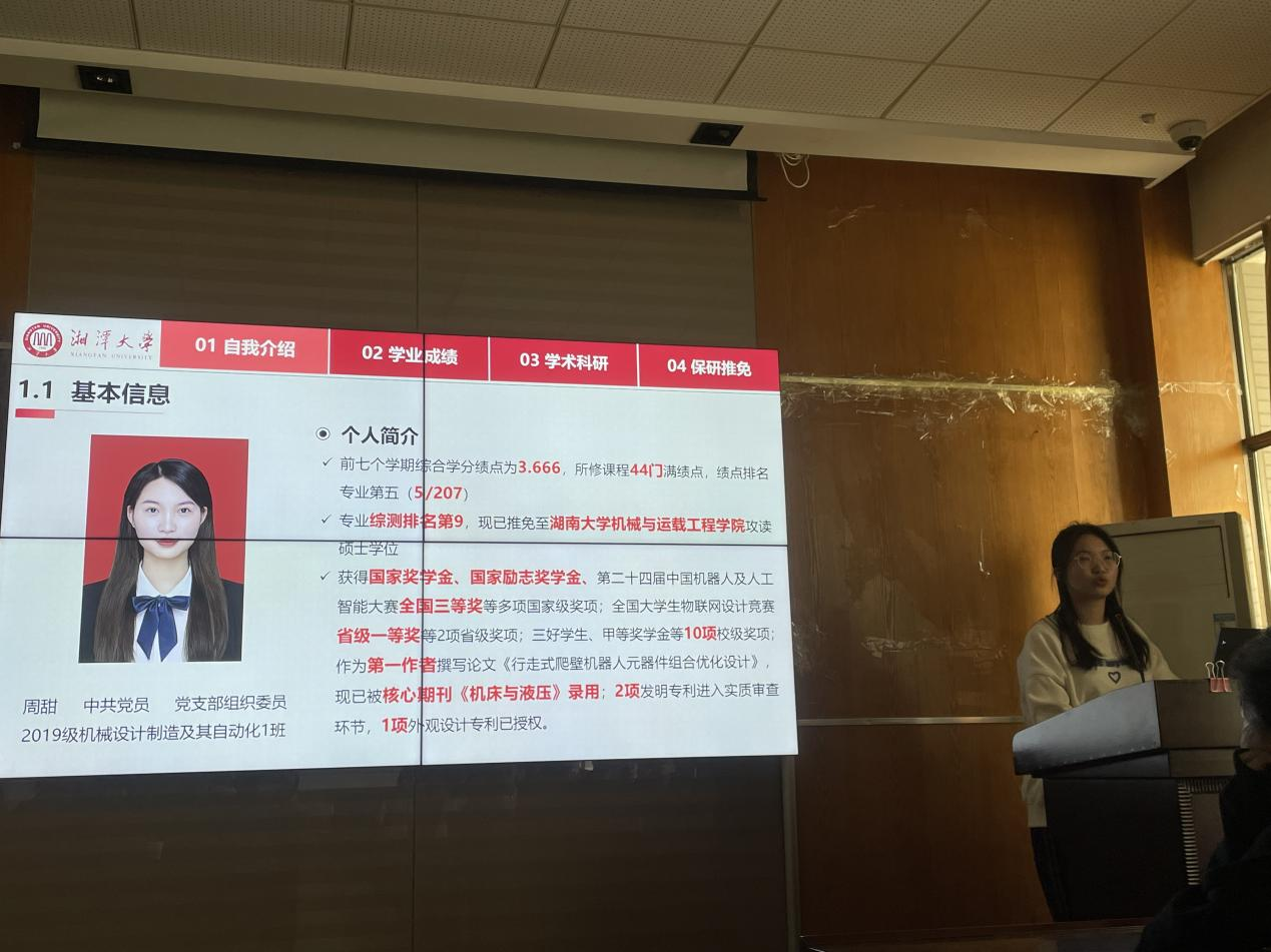 最后是保研至湖南大学、曾获国家奖学金、国家励志奖学金、作为第一作者撰写论文《行走式爬壁机器人元器件组合优化设计》的周甜。周甜较为全面地讲解了保研全过程,她表示,根据学校保研政策,同学们需要保持优秀的学习成绩。科研经历比较重要,在大学可以通过竞赛来拓宽知识面从而全面提升自身的科研能力与创新能力。在保研历程中,还要关注本校的保研政策已经意向学校的录取条件。她列举出各类竞赛名单以及校方推免政策并且划出重要时间轴以供参考。最后为同学们分析了两种保研方式的优劣也提出了自己的珍贵意见。