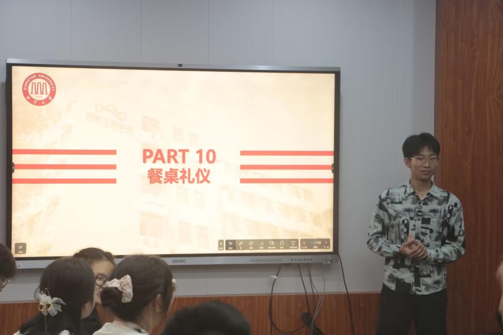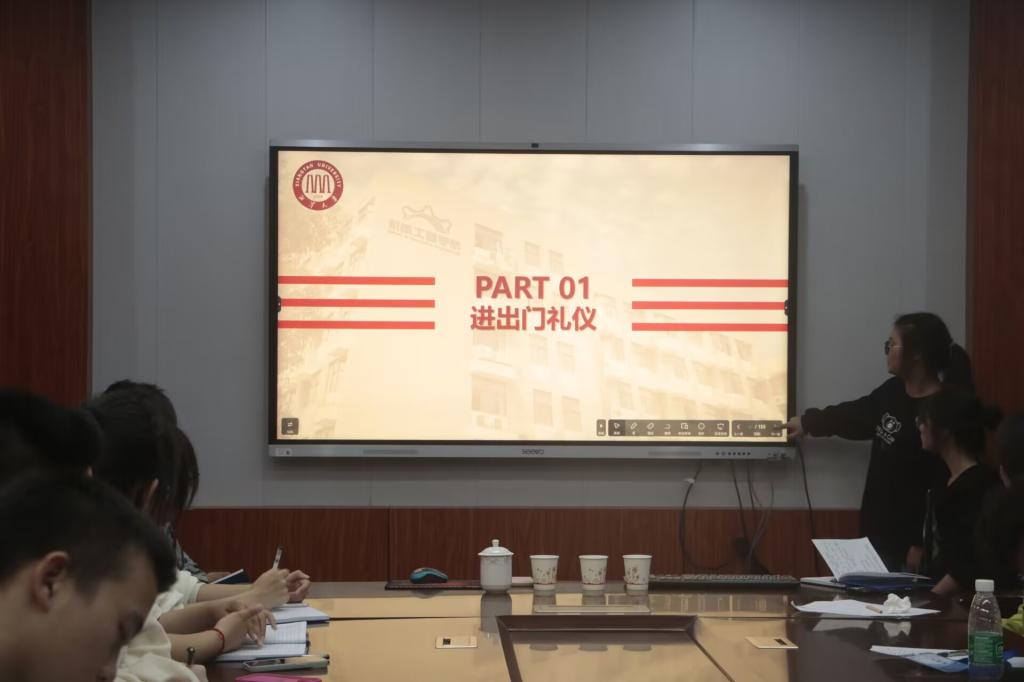 讲座第二部分,由学工助理为大家介绍工作生活中常用的礼仪,其中包括进出门礼仪、电话礼仪、会议礼仪等办公室礼仪以及引路礼仪、握手礼仪、餐桌礼仪等生活常用礼仪,培训过程中将各个礼仪细致化,形象化。学生通过观看视频,了解实例充分认识到礼仪在生活工作中的重要性,让基本礼仪走进学生的日常生活。