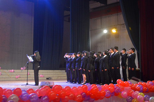 晚会第一部分是成人礼。全场起立,奏唱国歌,由14级全体班长和团支书带领大家宣读誓词。