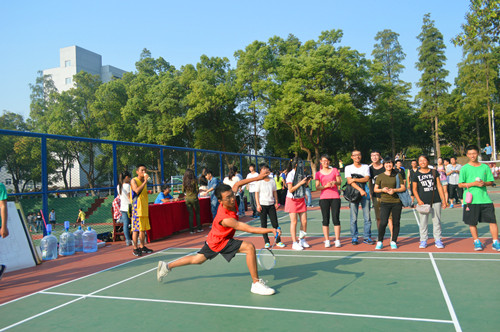 上午8点20分,羽毛球赛正式开始。本次羽毛球赛共分男单、女单、和男女混双三个项目。参赛顺序由各部门抽签决定,各部门之间进行两两对决,两轮后优胜者进入决赛。决胜局由三位选手两两角逐,以三局两胜制的形式判决输赢。比赛进行得十分激烈,参赛人员情绪高涨,赛场上呐喊声和加油声响成一片。在男单决赛中,宣传部的丰佳铭和心理部的陈锦煌进行王者对决,双方几经厮杀,难分伯仲,最终心理部的陈锦煌以微弱的优势险胜丰佳铭登顶男单冠军。女单和混双的冠军分别被公关部和实验室夺得。