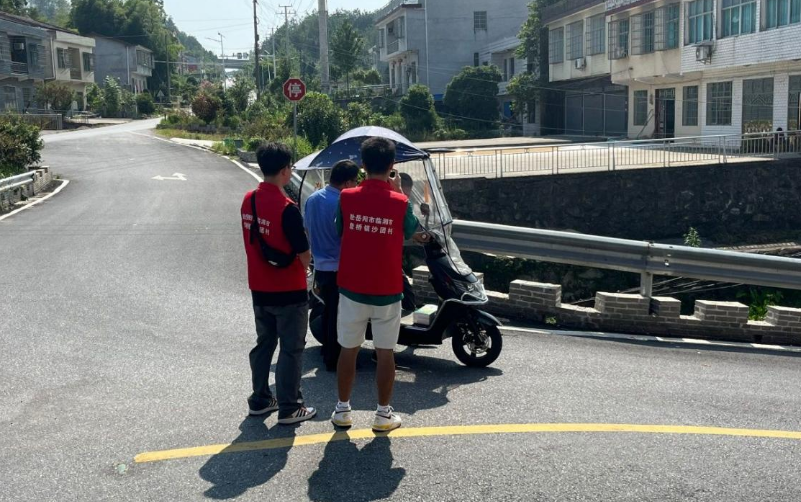 随后,实践团成员在村辅警的陪同下对村里主干道进行文明交通劝导。实践团成员对骑行电动车不按规佩戴头盔的村民以及违规加装雨蓬的村民进行解释劝说,提醒他们要按照相关规定佩戴好头盔,不要违规加装雨蓬,保障出行安全。村辅警邓成同志对实践团成员说道:“村民经常因为天气炎热而不佩戴头盔,也为了避免突遇的风雨而装上雨篷,这些都是属于违规骑行。”加装雨篷虽然能遮阳避雨,但却大大降低了安全系数。一是电动车加装雨篷使车体面积扩大,增加了碰擦事故的发生率,影响转弯的机动灵活性,不利于快速避险。二是行驶过程中阻力增大,容易重心不稳发生摆动和侧翻,引起交通事故。三是影响骑行者的视线,不利于观察路况。四是加装的雨篷多为金属结构,一旦发生事故容易带来二次伤害,存在极大的安全隐患。此外,实践团成员也用因加装雨蓬导致的电动车事故实际案例来劝说村民要遵循相关规定,安全出行。由于夏季天气炎热,实践团成员遇到了不少未佩戴头盔的村民。辅警同志拦下这些乡亲,用亲切的家乡话耐心劝导,在辅警同志和村民之间半家常半劝导的聊天中,实践团成员也了解到沙团村过往的一些历史,包括沙团村之前叫“沙滩村”等,同时也看到了乡村基层工作者与人民群众的鱼水之情。