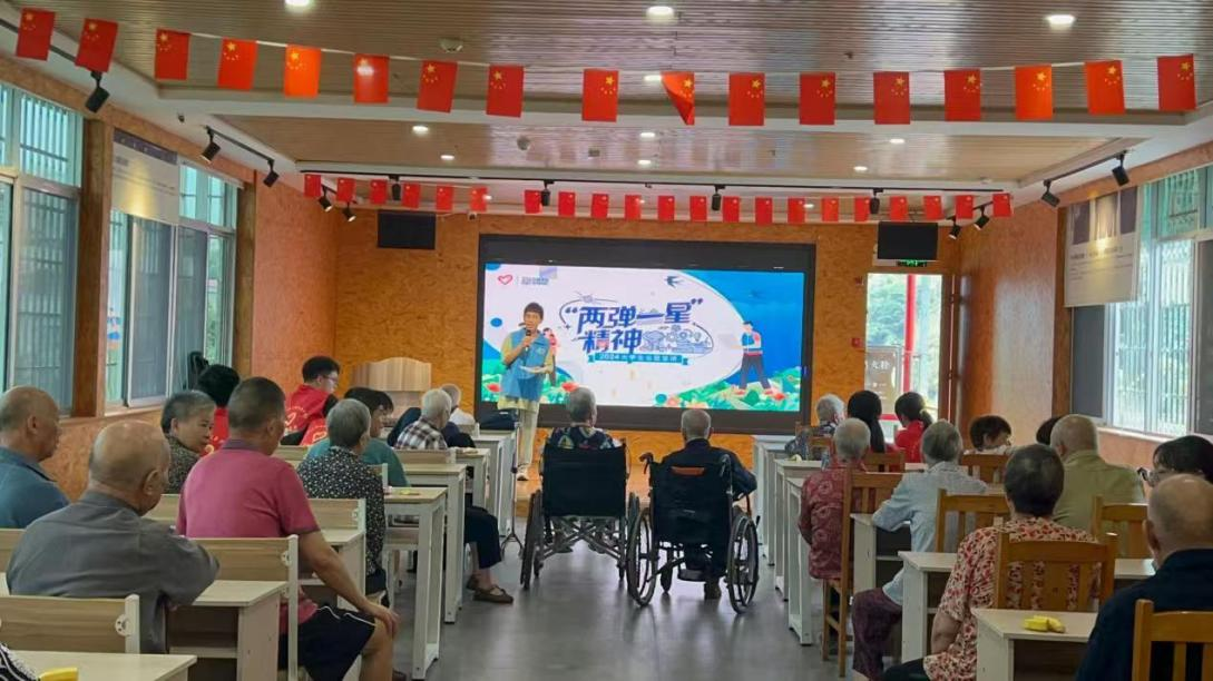 在锦德养老院,观看爱国影片《钱学森》,老人们纷纷回忆起当年国际形势的严峻、研发条件的艰辛、项目成功的不朽功勋,教育大学生们要努力接好时代的接力棒。