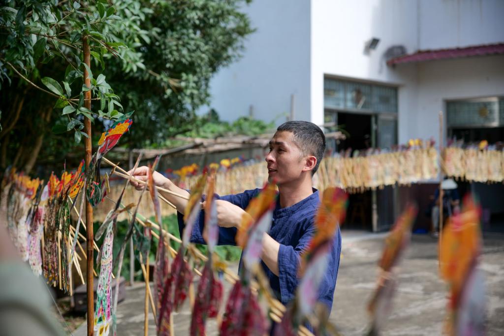 阳光倾洒,吴渊老师将色彩明艳、雕刻精美的皮影一一展开晾晒。这些皮影的每一处线条、每一抹色彩都蕴含着匠人的心血与传承的坚守。晾晒不仅是为保存,更是一次与传统的深度对话。在日光下,皮影的细节纤毫毕现,其承载的民俗风情、历史故事仿佛也被唤醒,展现出非遗的独特魅力,引得团队成员纷纷驻足,感受这份来自岁月深处的文化韵味。