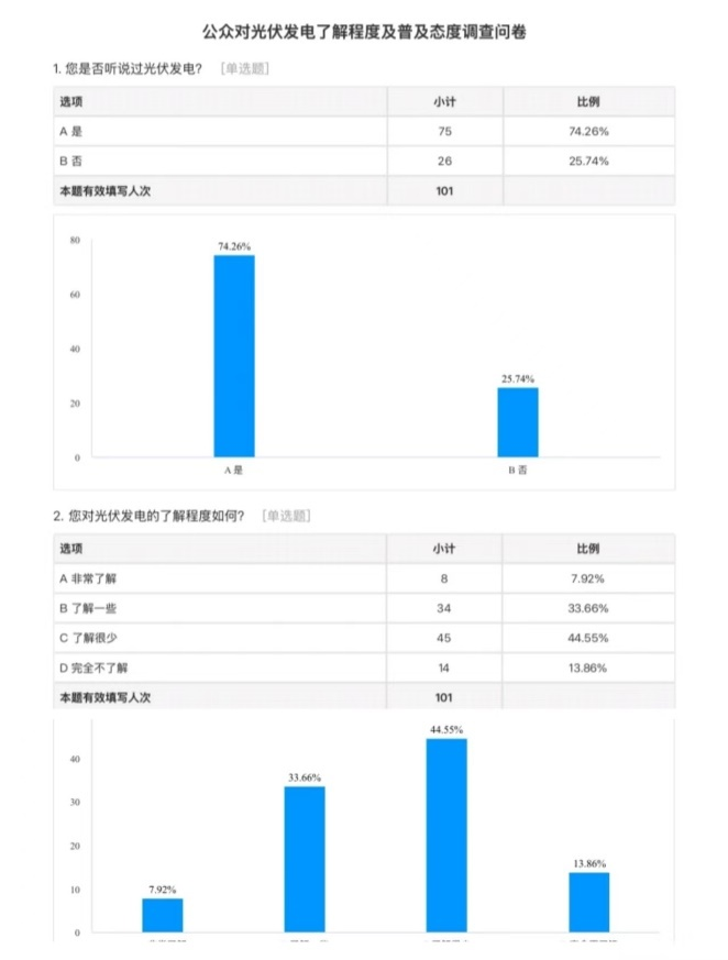赴耒阳暑假社会实践团成员在耒阳社区设置宣传点,向居民发放纸质问卷与推广线上调查,从调研数据来看,当地公众对光伏发电的认知呈现“有基础但不深入”的特点。74.26%的受访者表示听说过光伏发电,但深入了解程度有限,仅7.92%的人“非常了解”,而“了解很少”和“完全不了解”的受访者合计占比达58.41%,这表明光伏发电的普及深度仍需加强。