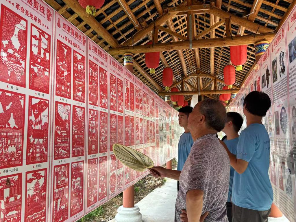 在剪纸艺术馆各个展室的墙壁上, 贴满了各式各样的剪纸作品,全面体现宁乡风土、人文、生活的《楚沩盛世图》,1118个农耕渔樵人物穿梭于98处山水楼台间,采茶女鬓角流苏随风轻颤,渔夫网中锦鲤跃然欲出;《中华英烈图》由18幅小图组成,勾勒了聂耳、张思德等54位英雄烈士形象,惟妙惟肖,人物仿佛要从墙体中走出来;刘少奇同志诞辰系列更以36幅肖像分六章娓娓道来,从“时代先锋”的意气风发到“鞠躬尽瘁”的深锁眉头,红纸裁出伟人一生波澜。参观队伍无不被眼前这一幅幅剪纸艺术品深深吸引。