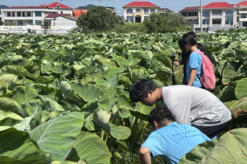 晨雾如轻纱漫卷湘中丘陵,金穗垂首的稻田与苍翠芋叶在夏风中共舞,队员们踩着露珠浸润的田埂深入乡野——这里,正酝酿着一场从有毒野芋到黄金产业的蜕变传奇。在公司易总的带领下,实践团来到香芋发源地,野芋虽有毒,但它却是孕育湘芋的千年基因密码。野芋根系盘结如龙,叶片背面紫纹暗涌,恍若大地埋藏的玄奥图腾。从毒源到佳肴,恰似凤凰浴火——产业涅槃路,由此开端。