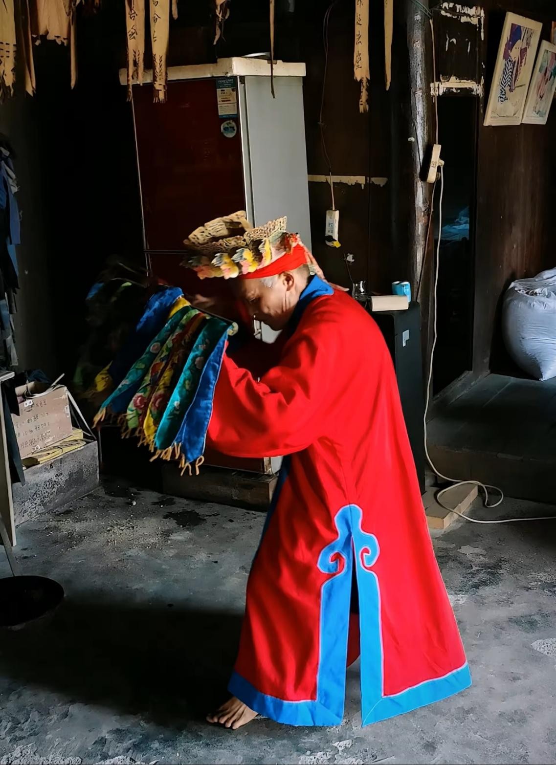 下午时分,石师傅带领团队前往法坛。他身着红色法衣,头戴牛皮头冠,手持司刀和绺巾。随着一阵低沉的号角声响起,石师傅踏着沉稳的步伐,跳起了传承千年的绺巾舞。每一个转身都充满力量,每一次挥刀都精准有力,手中的绺巾在空中划出优美的弧线。这灵动而庄重的舞姿,正是巴代文化活态传承的生动写照。石进荣师傅用数十年的坚守,让这门古老技艺在新时代依然绽放光彩。