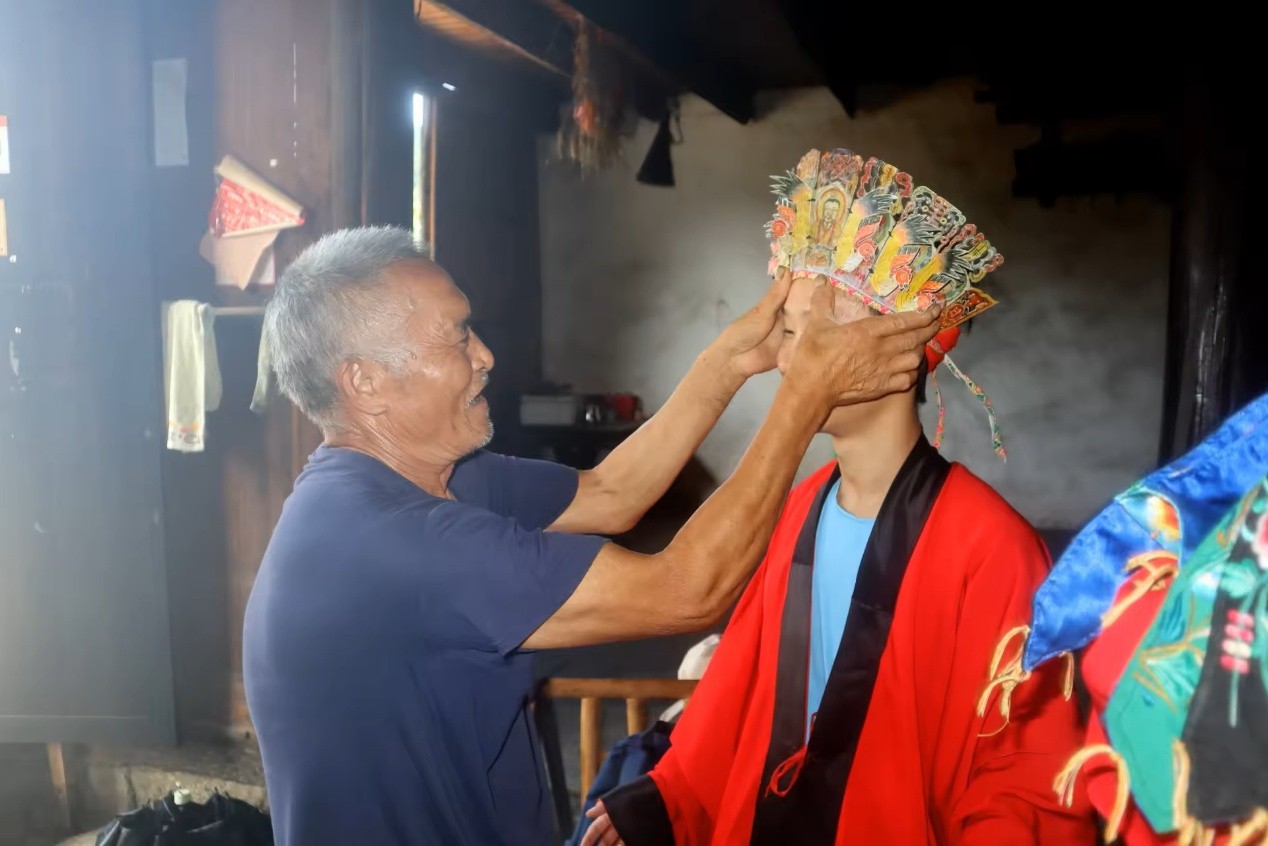 石师傅又拿出法衣和牛皮制成的头冠,盛情邀请队员试戴。当头冠戴在头上时,队员们真切感受到了巴代文化的庄严与神秘。这种亲身体验,让年轻一代与古老文化之间产生了强烈的情感共鸣,为非遗的代际传承播下了潜在的种子。