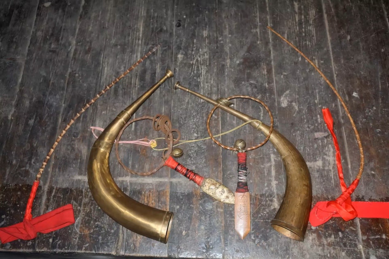 图为法器 从左往右依次为马鞭、号角、司刀