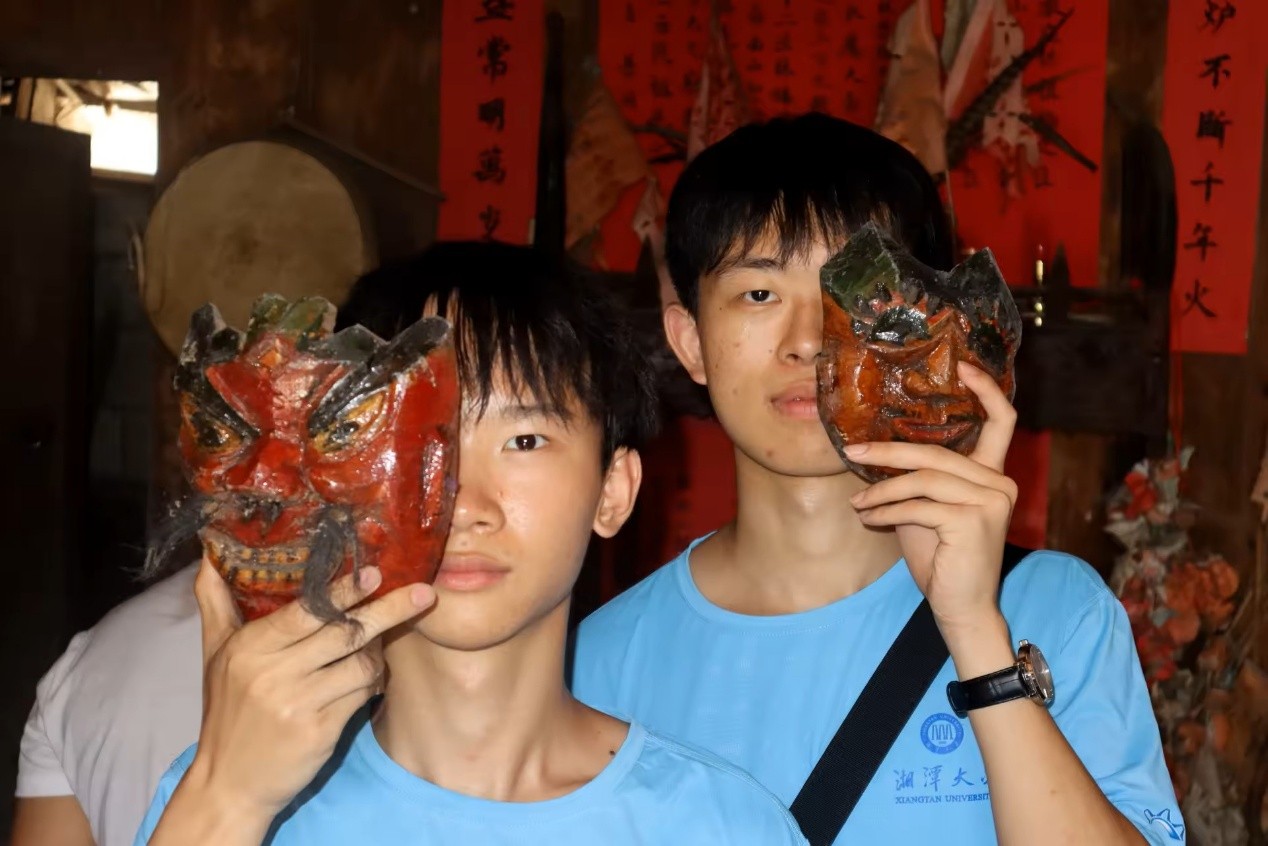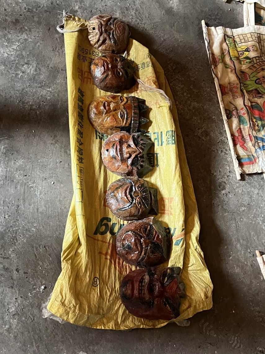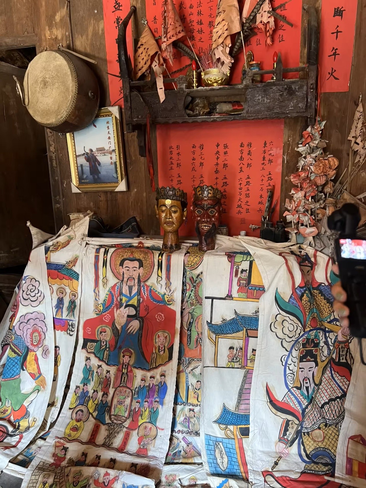 调研中,实践团系统观摩了龙云凤师傅珍藏的傩文化实物资料。其中包括手绘傩神画像、七副采用传统雕刻技法制作的傩面具,以及一对象征傩戏核心信仰的傩公傩母神像。