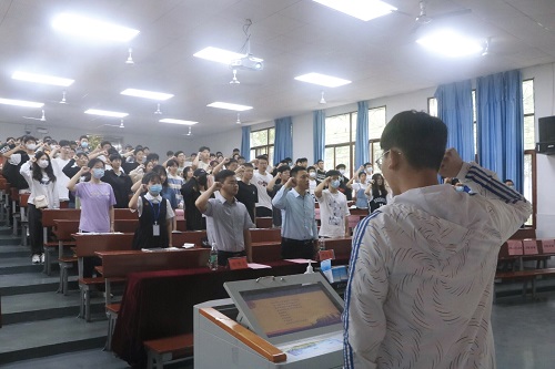 在组织部干事唐志远的带领下,同学们一起唱响了团歌《光荣啊,中国共青团》。同学们精神饱满,嗓喉响亮,唱出了青春的活力和报效祖国的壮志雄心。随后,全体参会人员在机械工程无码影片 团委学生会主席蒋凌峰的带领下进行入团宣誓。铮铮誓言响彻整个教室,也深深烙印在同学们的心上。