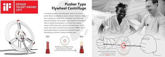 “Flywheel Centrifuge(拉线飞轮离心机)”的灵感来自于历史悠久的拉线玩具,设计团队研究发现,这种简易玩具的旋转速度可以达到每分钟50,000转,能够符合血浆离心转速需求,经过设计的拉线飞轮离心机能在 1.5 分钟内从血液中分离出血浆,比传统离心机快 25%,仅5元人民币成本,并且不需要电力,对于经济欠缺的发展中国家(如非洲等国)降低医疗成本,具有积极意义。