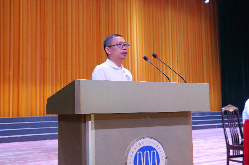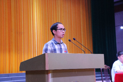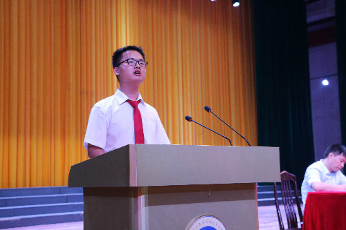 紧接着,老生代表2015级机械专业研究生黎旭发表演讲,讲述了自己的大学经历和感想。“谈恋爱也比宅在寝室好”一句点出了目前大学生中的“不良”现象。他强调大学生要培养自信,自信是力量的源泉。他鼓励大家努力学好学科专业知识,不放松不懈怠,不断延续高中拼搏的精神,同时也表达了对新生的肯定与期望以及对老师辛勤付出的感谢。