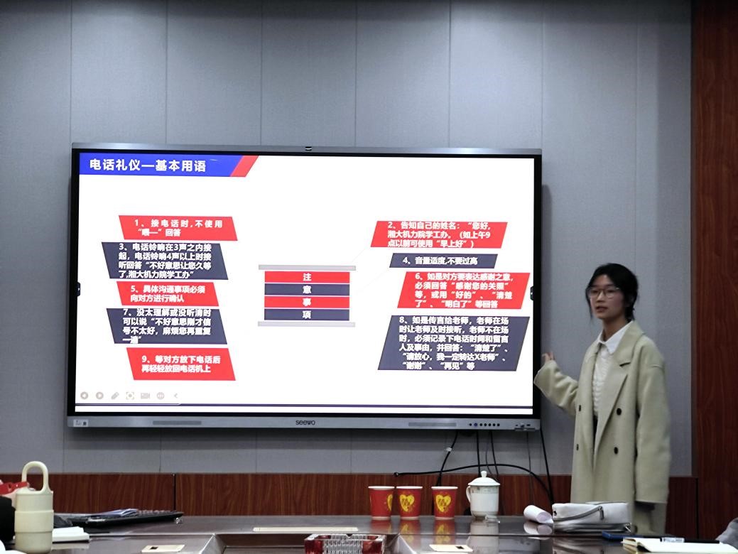 培训采用案例解析与实景演练相结合的模式,聚焦沟通礼仪、会议规范及接待流程等礼仪细节。在互动交流环节,参训学员通过情景模拟、分组研讨等形式展开深度实践,现场气氛热烈。新进助理表示:“此次培训不仅让我掌握了实用的礼仪技巧,还深刻体会到责任意识与主动服务的重要性,这些知识对我们未来协助老师开展工作特别有帮助!”