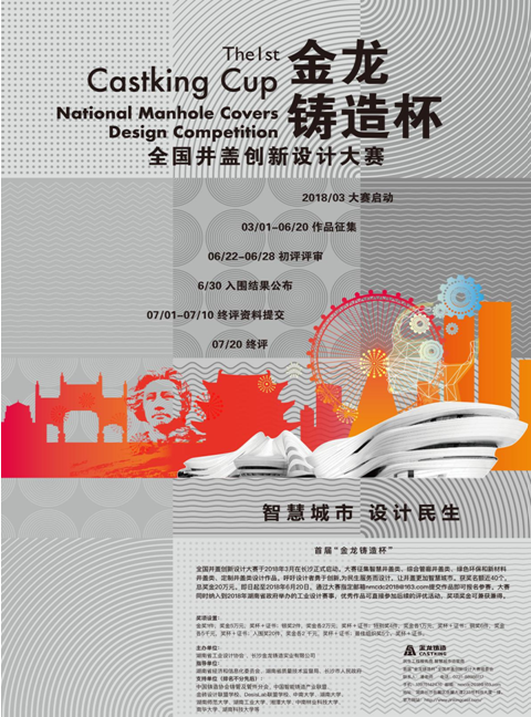 首届“金龙铸造杯”全国井盖创新设计大赛是在湖南省经信委等指导监督下,由湖南省工业设计协会和长沙金龙铸造实业有限公司联合主办,以城市井盖产品为对象的专项创意设计竞赛。本次大赛呼吁设计者一起关注城市建设,以井盖的创新设计为指引,弘扬全民创新精神,为民生服务而设计,为城市的公共生活而设计,将互联网+、绿色制造、文化艺术等与之结合,创造更为完美的井盖及相关配套产品。大赛同时纳入到2018年湖南省政府举办的工业设计赛事,优秀作品可直接参加后续的评优活动,奖项奖金可兼获兼得。