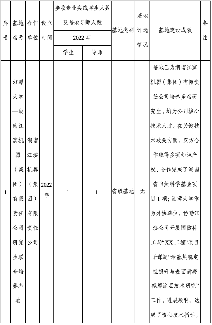 (2)校企合作,推动产教融合。本学位点紧密结合国家重大需求和机械行业发展态势,通过与企业合作开展实践教学、组织学生参观企业并进入企业实习实践、鼓励学生参加行业论坛和指导学生参与企业技术咨询项目等方式,建立产学研一体化的人才培养模式,促进学生在实践中不断提高综合素质和创新能力。本学位点积极利用社会资源培养研究生实践能力,与校外企事业单位合作,建立联合培养基地(实习基地)。联合培养基地通过选派实践导师、提供实习机会及举办专题讲座等方式深度参与研究生培养,并为部分优秀毕业生提供就业岗位;研究生在校外实践导师的指导下积极参与校外导师所在单位的生产实践,提高了的社会实践能力。学位点则通过为相关企业培训业务骨干、提供继续教育机会及咨询服务,为企业发展提供智力支持。借助双赢合作,促进了产教融合。