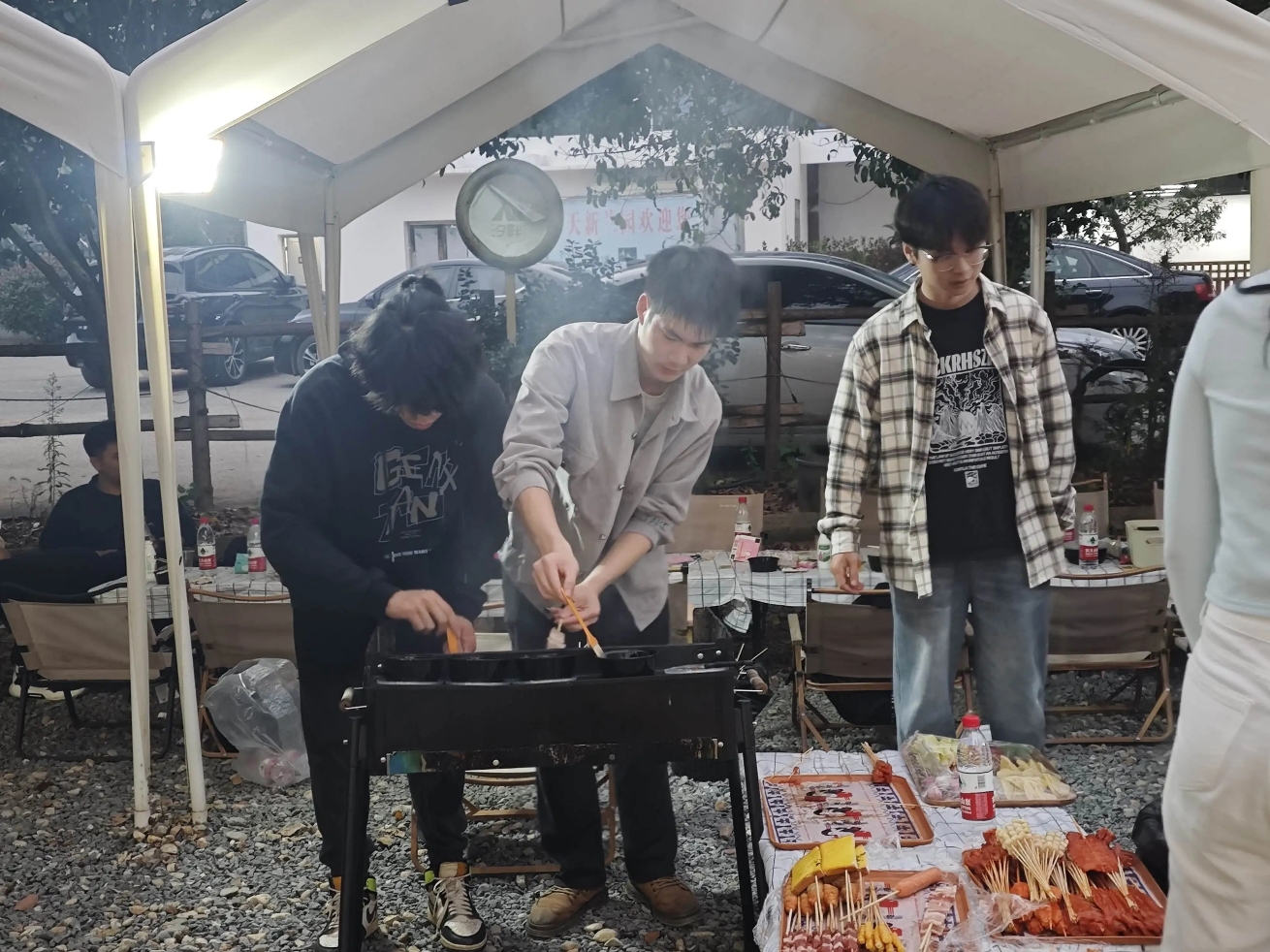 当夕阳的余晖渐渐隐没于天际,令人期待的烧烤晚宴终于开始。烧烤架、配料、满满的烤串都已经准备就绪,同学们各自忙碌起来。虽然一开始因为缺乏经验,出现了各种失败品,比如被烧的焦黑五花肉、牛油的木签子被烧断后掉入了炭火中,但这些小插曲反而成为了大家欢笑的源泉。随着经验的积累,同学们也渐渐熟练了起来,烤肠的香、肉丸的嫩、鸡翅的酥、羊肉串的鲜,一一呈现,香气四溢,让人垂涎欲滴。持续了两个多小时的烧烤派对渐渐落下帷幕,天空也已经黑了。