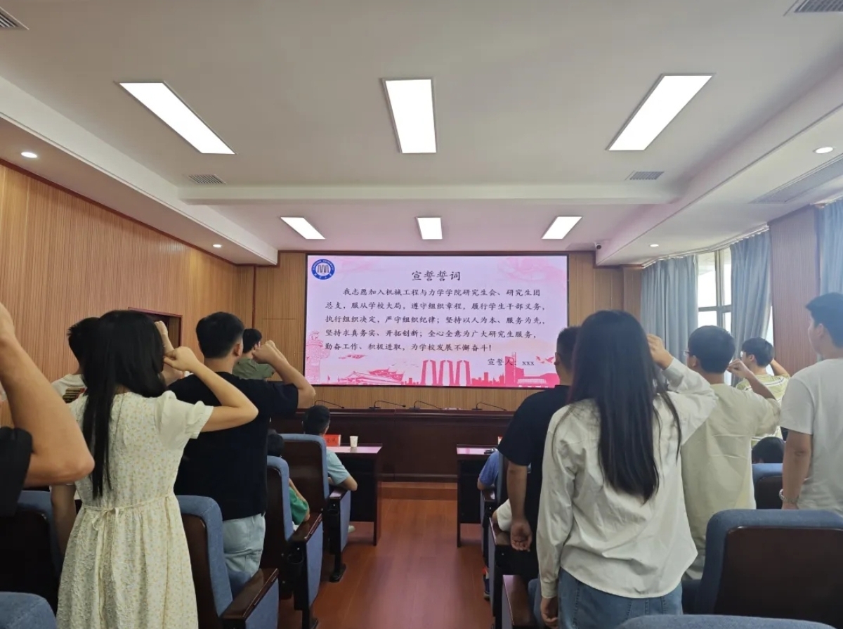 随后,无码影片 第二十届研究生会、团总支成员宣誓。在肃静的会议室里,全体学生干部右手握拳,面对屏幕上的誓词庄严宣誓,抑扬顿挫的声音传递出他们的一腔热血,笔直站立的身姿更加宣誓出他们的坚定信念。“博学笃行,盛德日新”,耳熟能详的校训能切实感受到他们实学实干的坚毅,和将工作做好的决心。
