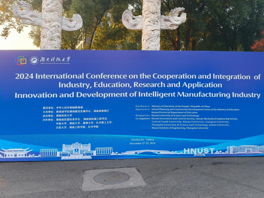 2024年12月27-29日,由教育部学校规划建设发展中心和湖南省教育厅主办,湖南科技大学承办,多家高校和企业合作承办的2024年国际产学研用合作会议于长株潭都市圈盘龙山庄大酒店召开。会议围绕“制造业智能化创新发展”展开,并设置了智能资源探采装备、先进制造技术与装备、智能检测与诊断、智能设计方法与运维、智能青年学术论坛等5 个领域论坛。会议开幕式设在盘龙山庄大酒店大会堂二楼壹号厅,各高校领导师生、国内外著名专家学者、科技精英、产业领军人物等人参会。