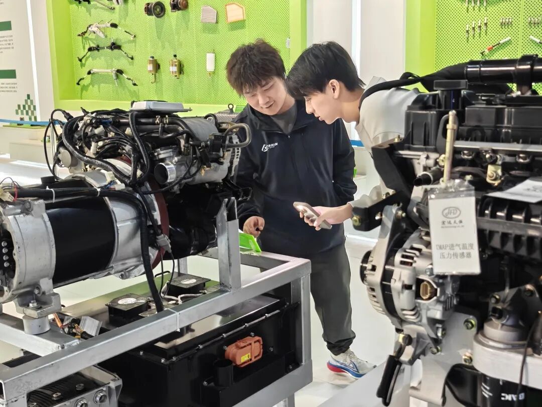 在中车株洲所展台,师生重点参观了列车牵引与控制系统和永磁直驱牵引电机等核心部件,深入了解我国在轨道交通关键核心技术领域的自主创新突破。时代新材展示的车载储供氢系统一次加氢续航可达200多公里,一列氢能城轨列车每年可减少碳排放66吨,展现出“绿色智造”的创新成果。在“智道”电气化公路系统展台前,师生与参展人员深入交流,详细询问受电弓取电、绿电直连等技术原理,现场讨论氛围热烈。